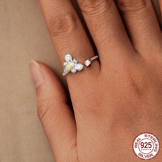 Deva 925 Sterling Silver Bee Adjustable Ring Embellished with Jade
